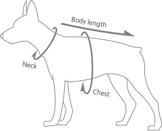 商品サイズの選択の際、胸囲と首周りはペットの測定サイズより1〜2cm余裕を持ってお選びください。